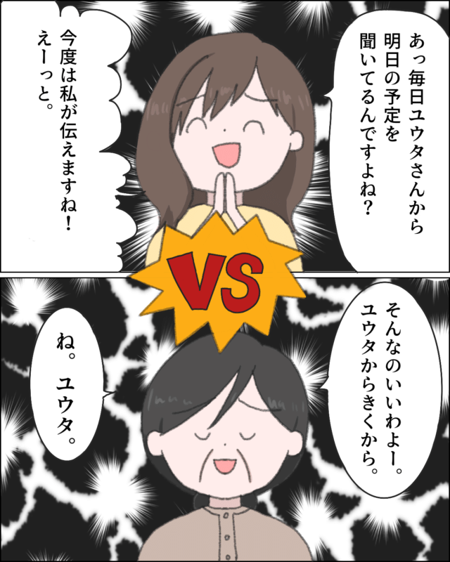 義母と繋がっているテレビ電話を占領したカナコさんは、「毎日ユウタさんから明日の予定を聞いてるんですよね?今度は私が伝えますね!えーっと。」と、ユウタさんの代わりをつとめようとすると、「そんなのいいわよー。ユウタから聞くから。ね。ユウタ。」と、義母はカナコさんと話すつもりはない様子です。