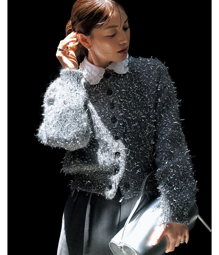 ニット¥66,000(デパリエ/デパリエ 伊勢丹新宿店)ブラウス¥7,990(Gap)パンツ¥36,300(ロエフ/エイチ ビューティー&ユース)バッグ¥37,400(ヴァジック/ヴァジックジャパン)ピアス¥9,900〈カラ・ユ〉右手小指リング¥12,100〈ニナ・エ・ジュール〉(ともにショールーム ロイト)右手ダブルリング¥33,000左手リング¥29,700(ともにリューク)