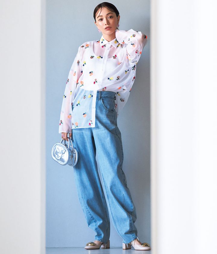 パンツ¥17,600(カデュネ)シャツ¥63,800(ロエフ/エイチ ビューティー&ユース)タンクトップ¥15,400(シー/エスストア)バッグ¥161,700(ピエール アルディ/ピエール アルディ 東京)サンダル¥163,900(ジャンヴィト ロッシ/ジャンヴィト ロッシ ジャパン)ピアス¥22,000リング¥19,800(ともにレヴェンス/RHC ロンハーマン)