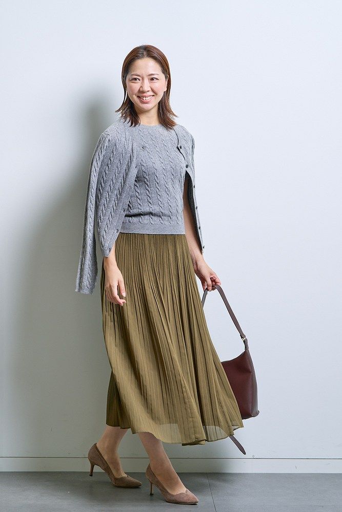 ケーブルクルーネックカーディガン¥3,990 ケーブルクルーネックセーター¥2,990 シフォンスカート¥3,990 レザータッチスクエアショルダーバ ッグ¥2,990(すべてユニクロ) 靴(私物)※すべてMサイズを着用
