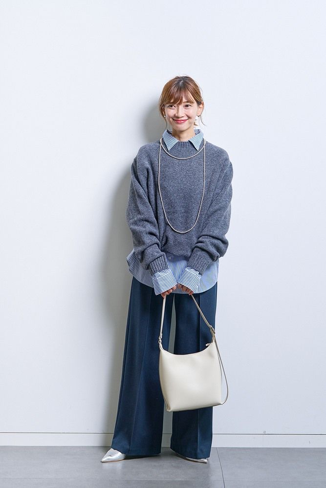 スフレヤーンクルーネックセーター¥2,990ブロードシャツ¥2,990ブラッシュドジャージーワイドパンツ¥3,990レザータッチスクエアショルダーバッグ¥2,990(すべてユニクロ)シューズ(私物)※セーターⅬサイズ着用、ほかМサイズ着用