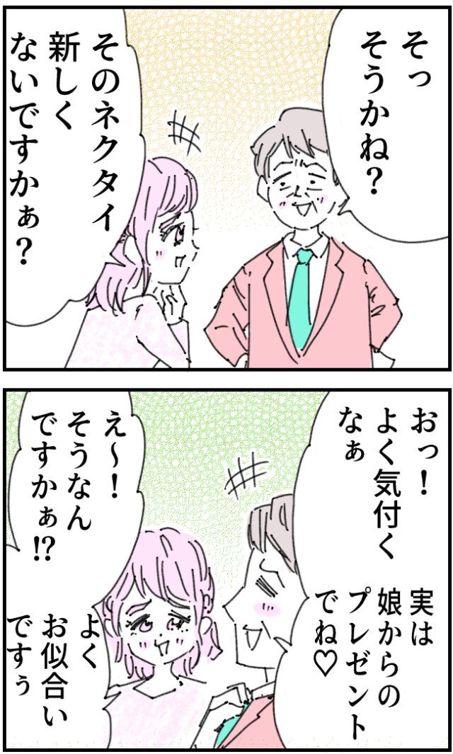 「そっ、そうかね?」なんだかうれしそうな部長、「そのネクタイ、新しくないですかぁ?」すかさず言う白石さん、「おっ!よく気づくなぁ。実は娘からのプレゼントでね(ハート)」とデレデレ状態の部長に「え~!そうなんですかぁ!?よくお似合いですぅ」と繰り返す白石さん。