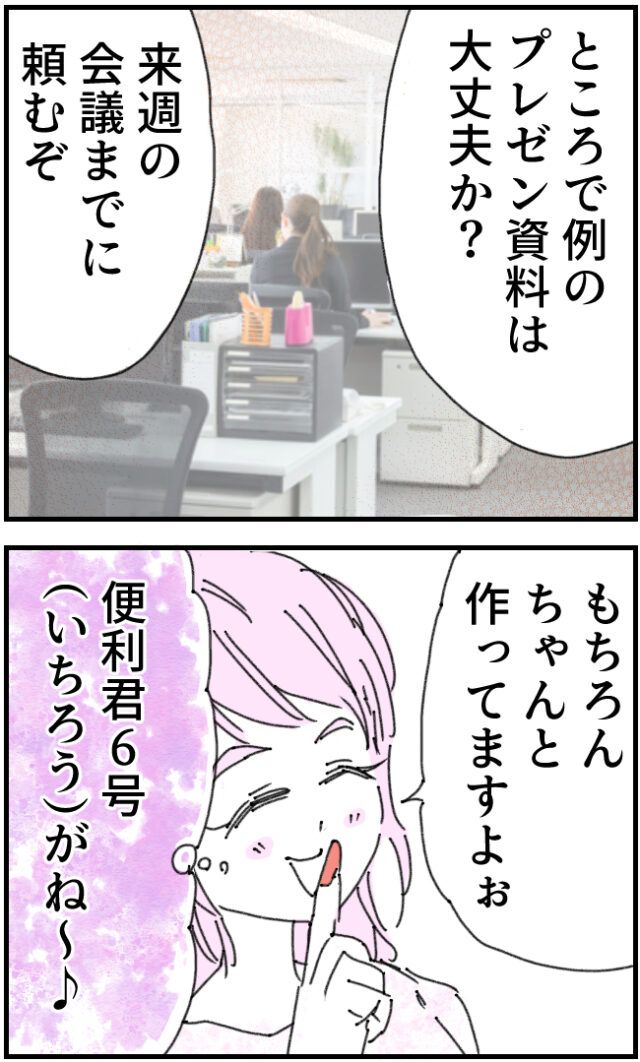 すると、「ところで、例のプレゼン資料は大丈夫か?来週の会議までに頼むぞ」部長に確認された白石さんは、「もちろん!ちゃんと作ってますよぉ」と返事をしつつ、「便利君6号(いちろう)がね~」と思っていました。