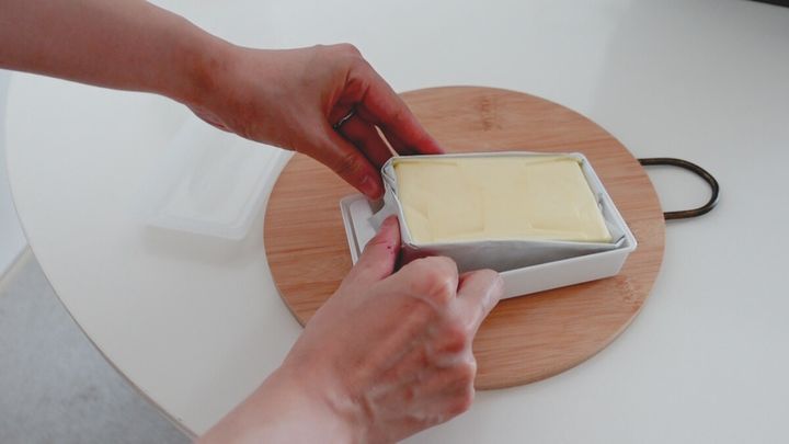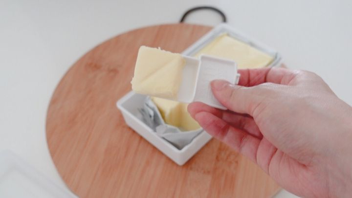 冷蔵庫から出したてのバターをさっそくカット。すっと真上から垂直に押すと、さくっと四角い形に切ることができます。