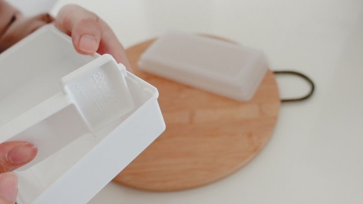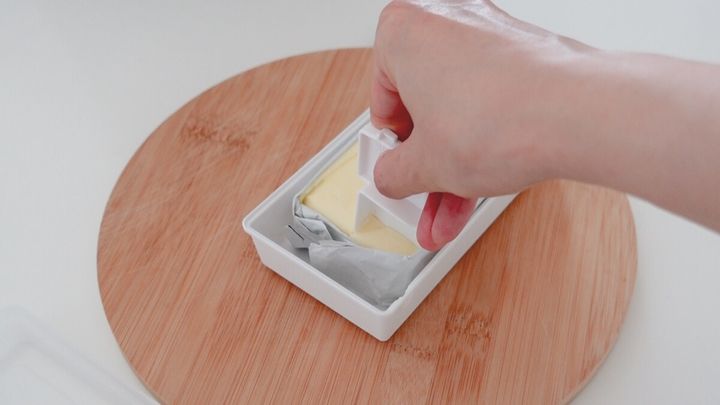 一見シンプルな普通のバターケースですが、開けてみると、中にはL字カッターがついており約10gの四角い形にカットすることができます。カッターが付いているため、別でカッターを用意する必要がなく手間いらず。
