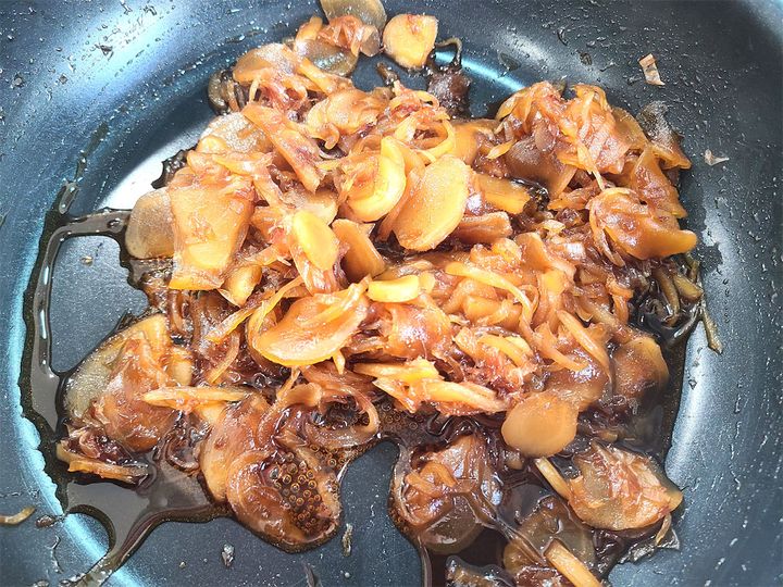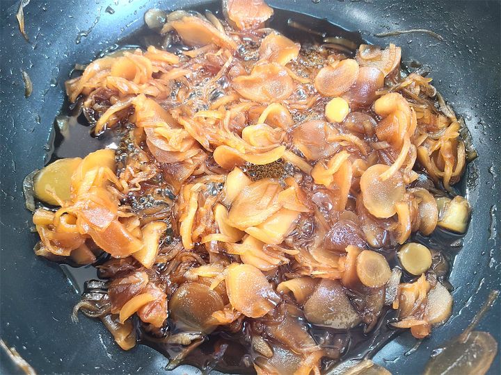 6. 5を鍋に戻し4の調味料を加え、弱火と中火の間くらいの火加減で煮ていきます。時々混ぜながら様子を見て、煮汁がほぼなくなるまで煮ます。