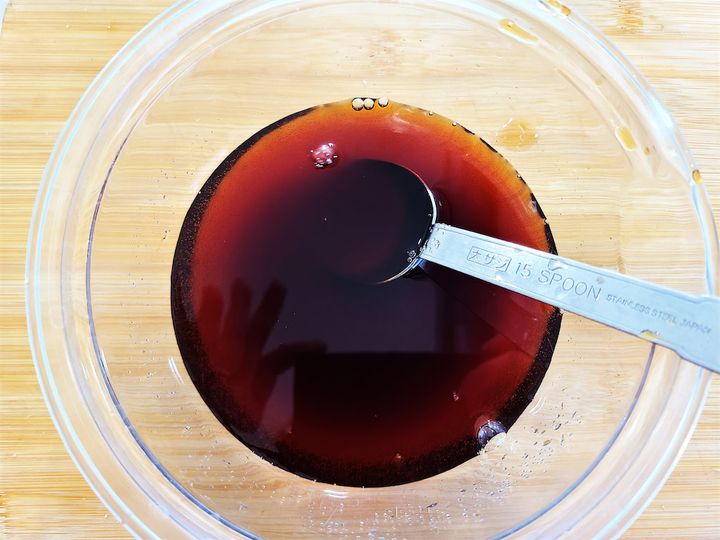 4. 別のボウルに調味料を合わせておきます。砂糖、みりん、酒、しょうゆを入れ、よく混ぜておきましょう。甘さを控えたい場合は、砂糖を大さじ5に減らすといいです!