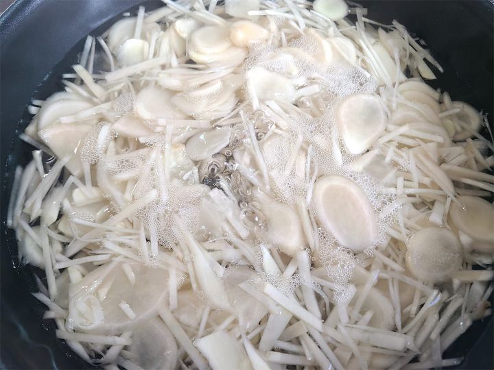 5. 3のしょうがを鍋か深めのフライパンに移し、しょうがが浸るくらい水を注ぎ、沸かします。沸いたら5分ほど茹でます。茹で上がったらお湯を切っておきましょう。辛さが苦手な場合は、この工程をもう一度繰り返すと辛みが抑えられます!
