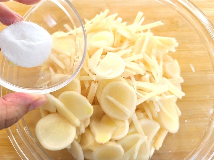 3. かつお風味な「新生姜の佃煮」作ろう!2度茹でして優しい辛さに♪薄切りと千切りにして食感も楽しい♡
