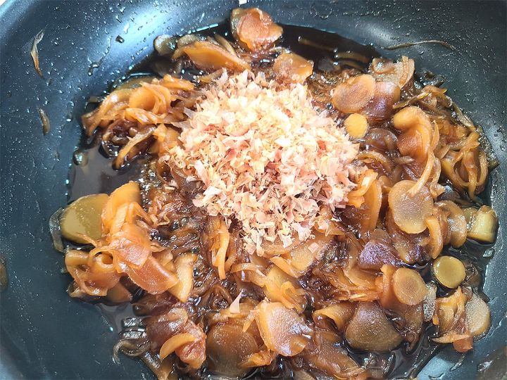 7. 煮汁がほぼなくなったら、かつお節を加えます。かつお節が残りの煮汁を吸って、いい感じに水分がなくなっていきます。