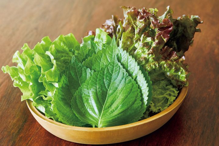 肉やおかずを包むための葉野菜として、もっともメジャーなのはサンチュ。ほかにも韓国ではえごまの葉がよく食べられています。えごまが手に入らない場合は、青じその葉を使っても。サニーレタスもおすすめです。