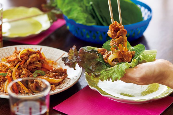 韓国語で、チュユク=豚、ポックム=炒めるという意味。日本の韓国料理店でもまず見かける、定番メニューです。豚肉と野菜をコチュジャンベースのたれで炒めたもので、甘辛い味わいが日本でも人気! ご飯とのおかずにするだけではなく、シャキシャキの葉野菜で巻いて食べれば、さらにおいしくいただけます。