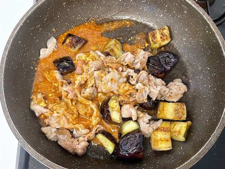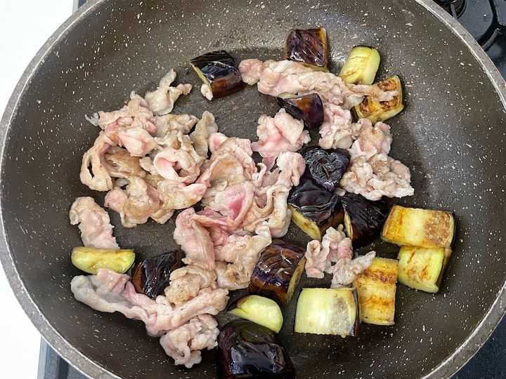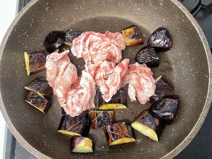 2. なすの皮が柔らかくなったら裏返し、豚肉を入れて片面にこんがり焼き色が付くまで中火で焼きます。