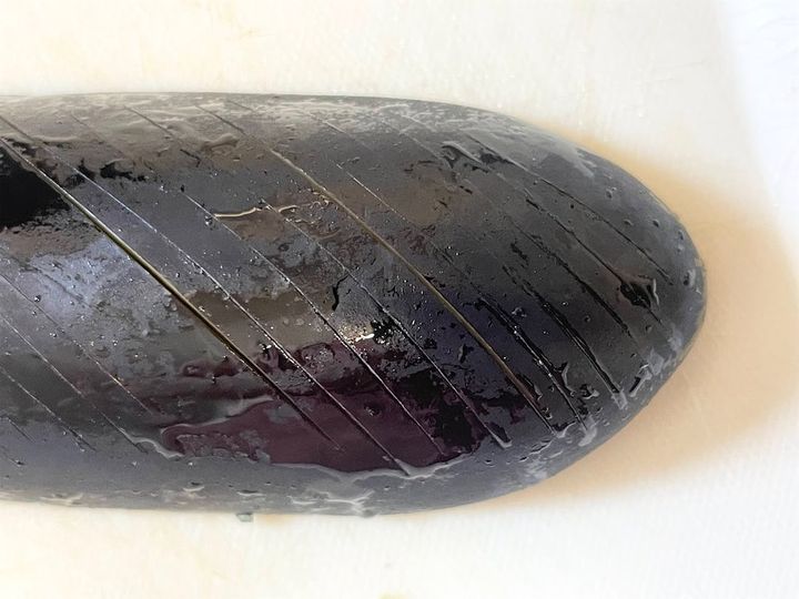 なすはガクとへたをとったら縦半分に切って皮に切れ込みを入れ食べやすい大きさに切ります。
