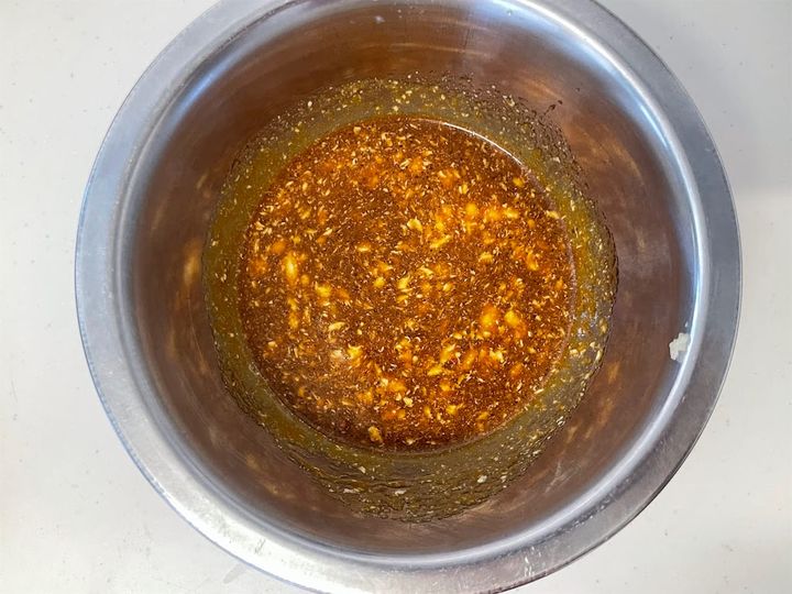 4. 弱火に切り替え1分ほど焼いたら[A]を回しかけます。