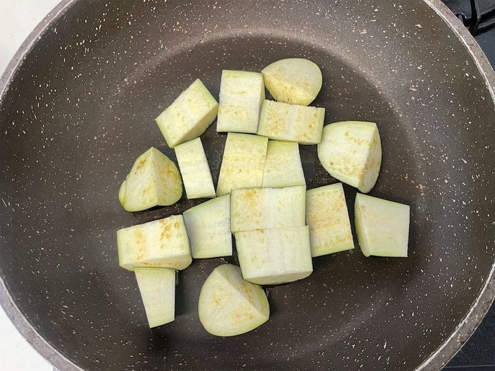 1. 大きめのフライパンにサラダ油を引き、なすを皮の方から加え皮全体に馴染ませたら、内側の方にも油を絡めます。なす全体に油が馴染めば再びなすの皮を下にして中火で焼きます。