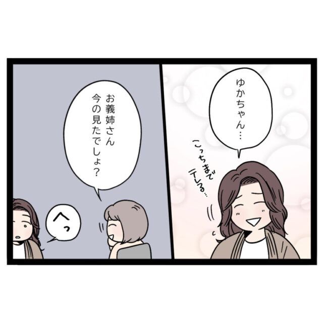 「ゆかちゃん・・・こっちまで照れる」と、微笑ましい光景を目の当たりにした雅美さんが言うと、ゆかさんが「お義姉さん、今の見たでしょ?」と言いました。