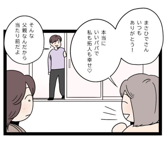 お風呂に向かうまさひでさんにむかって、ゆかさんはニッコリ笑顔で「まさひでさん、いつもありがとう!本当にいいパパで私も拓人も幸せ」と感謝の言葉を伝えました。まさひでさんは少し照れて「そんな、父親なんだから当たり前だよ」と嬉しそうに言いました。
