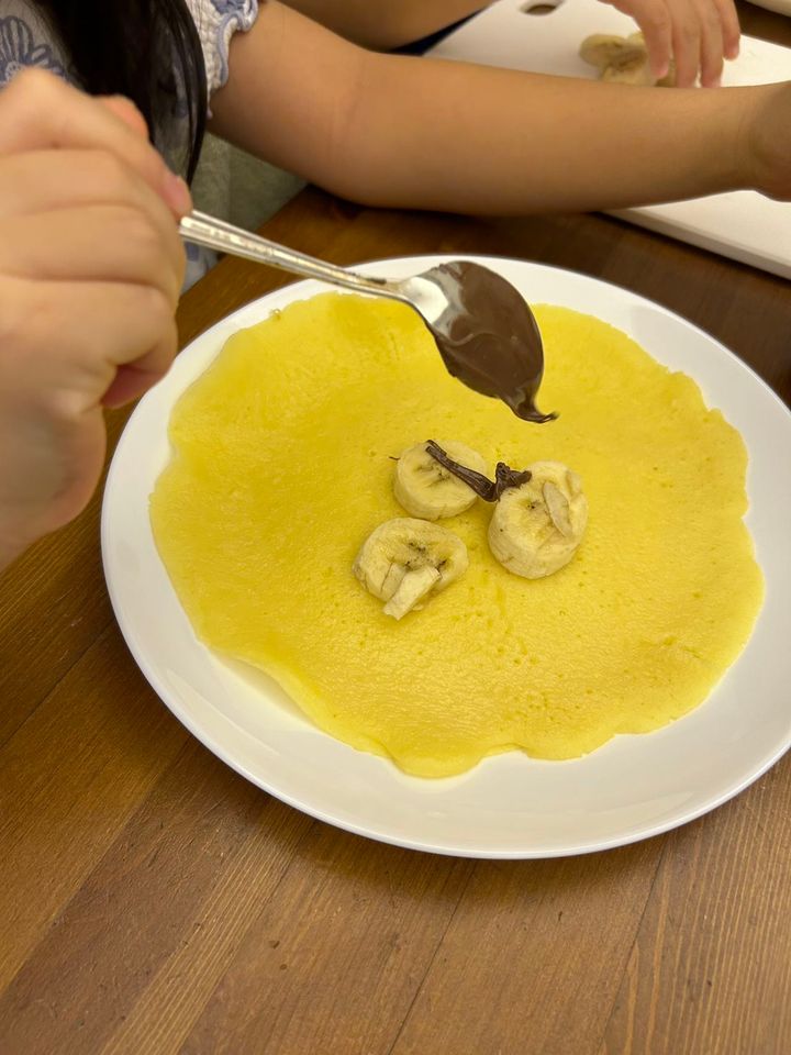 我が家はバナナとヌテラのチョコレートクリームをかけて頂きましたよ。