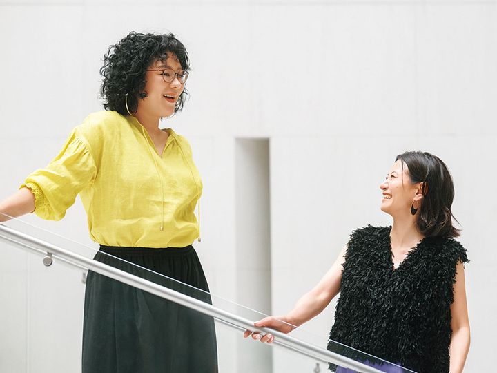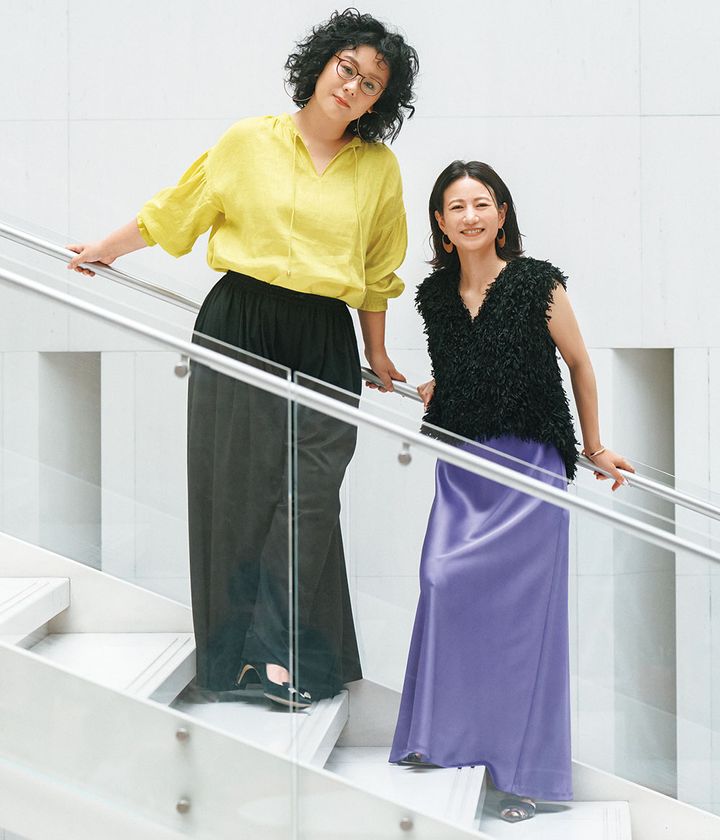 <スーさん>リネンブラウス¥10,989(ドゥクラッセ)パンツ¥29,700(LE PHIL/LE PHIL NEWoMan新宿店)パンプス¥130,900(セルジオ ロッシ/セルジオ ロッシ カスタマーサービス)ピアス/本人私物 <馬場さん>ニット¥16,500(CADUNÉ) スカート¥20,900(LE PHIL/LE PHIL NEWoMan新宿店)バングル¥16,500 リング¥13,640〈ともにエムシー・スタジオ〉 ピアス¥33,440〈ソコ〉(すべてZUTTOHOLIC)サンダル¥31,900(PIPPICHIC)
