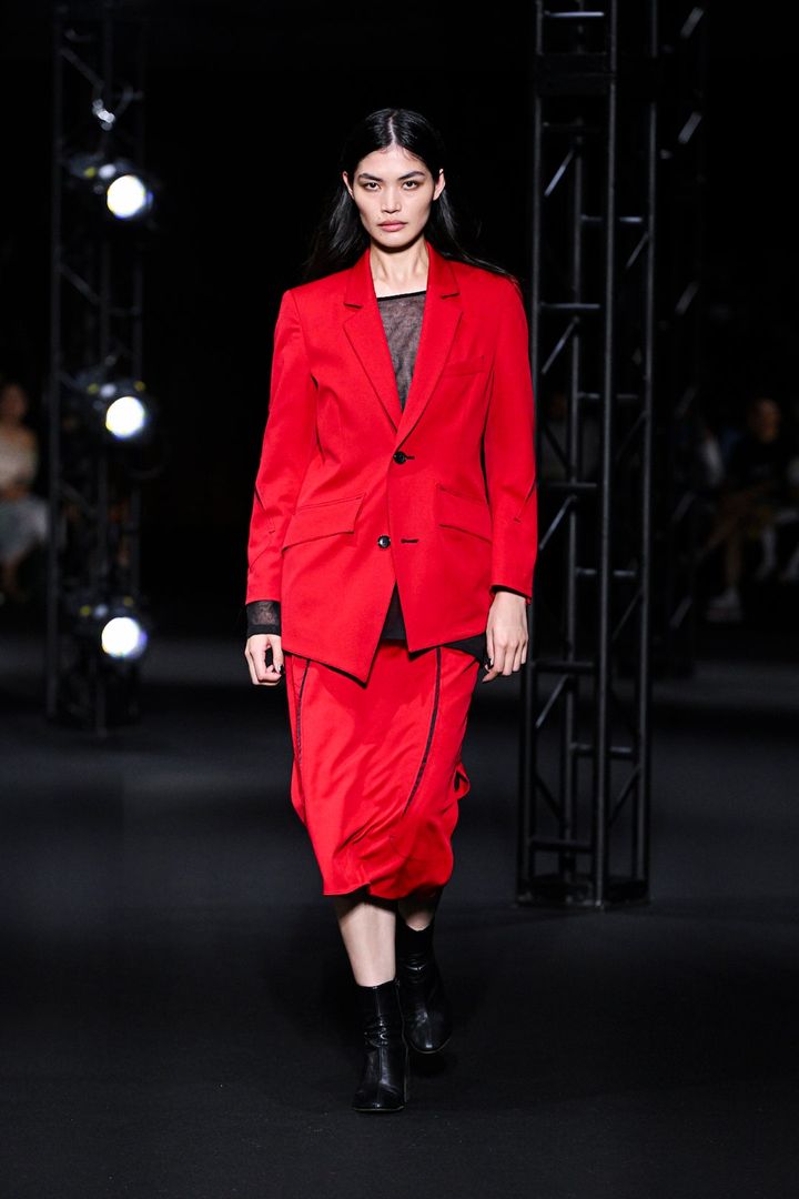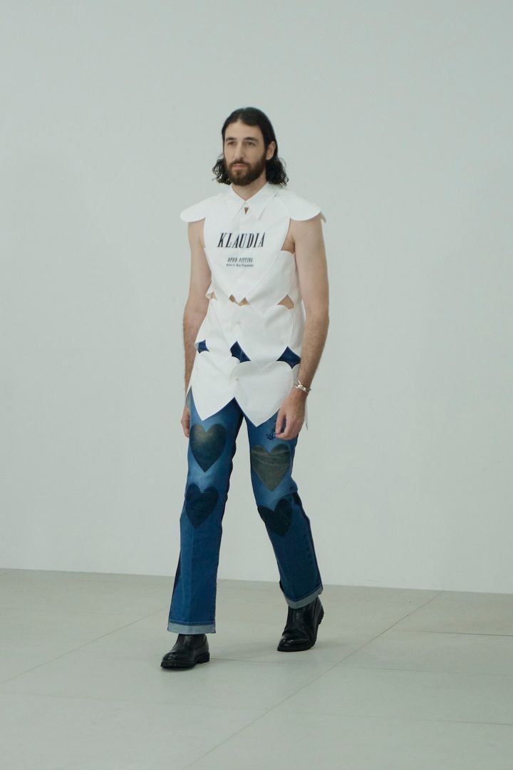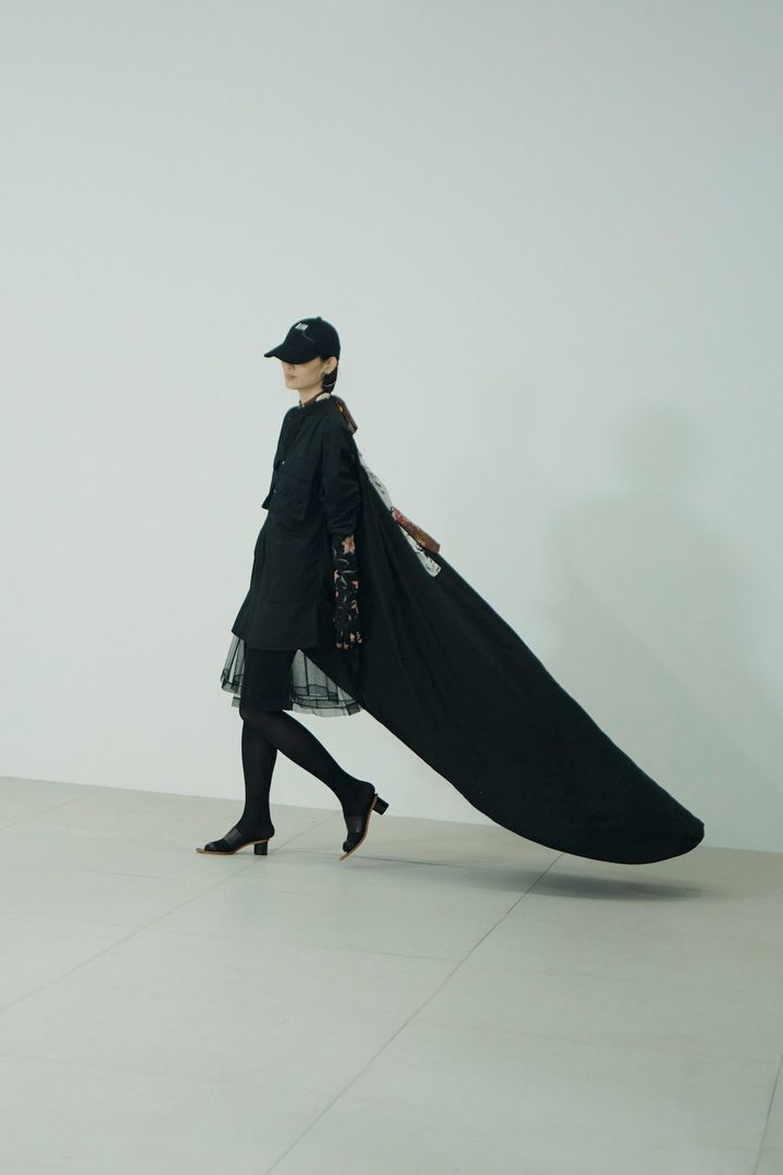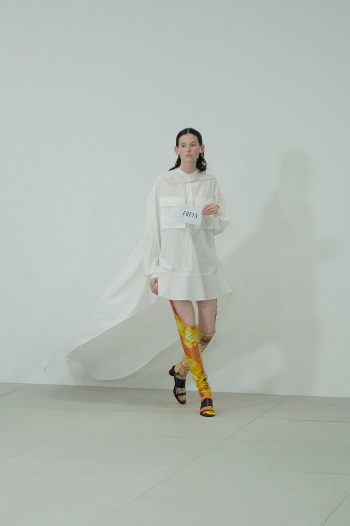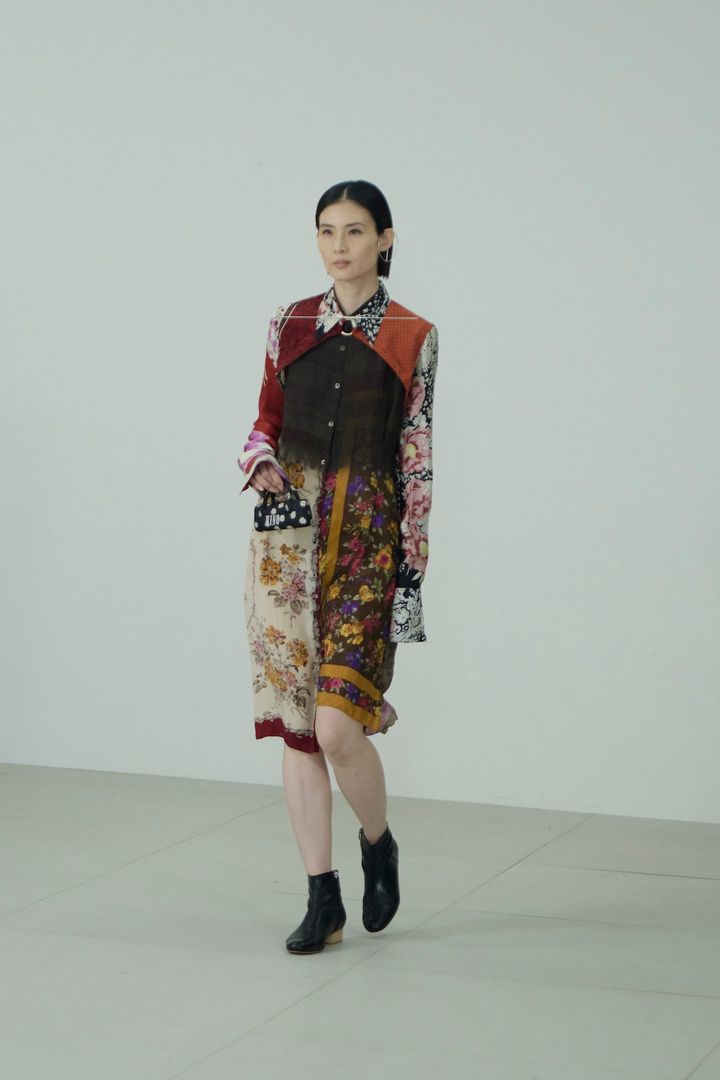 そして、曽祖父の代からスカーフを作る仕事を営む家系に生まれた砂川らしいスカーフ製のドレスをはじめ、デザイナーのルーツでもある奄美大島の泥染職人によって繰り返し染色されたアイテム、立体裁断で作り上げたクチュールのシルエットを日常的に着られるよう仕上げたTシャツドレスやシグネチャーともいえるハートのモチーフを用いたドレスシャツなど、これまでブランドが取り入れてきた多様なエッセンスも多分に織り交ぜた21ルックが登場し、デザイナーの挨拶と共に幕を閉じた。周囲の人々や自身のバックグラウンドへの愛が伝わる丁寧なプレゼンテーションは、終了後の会場を和やかなムードに包み込んでいた。
