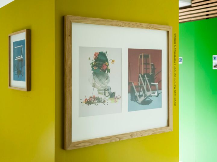 1階に展示された写真はすべて〈カリモク家具〉のオリジナル木製フレームとともに販売。また、作原さんがオリジナルのカラーを選んだ〈Karimoku New Standard〉の「Castor Stool Plus」限定モデルも販売する。