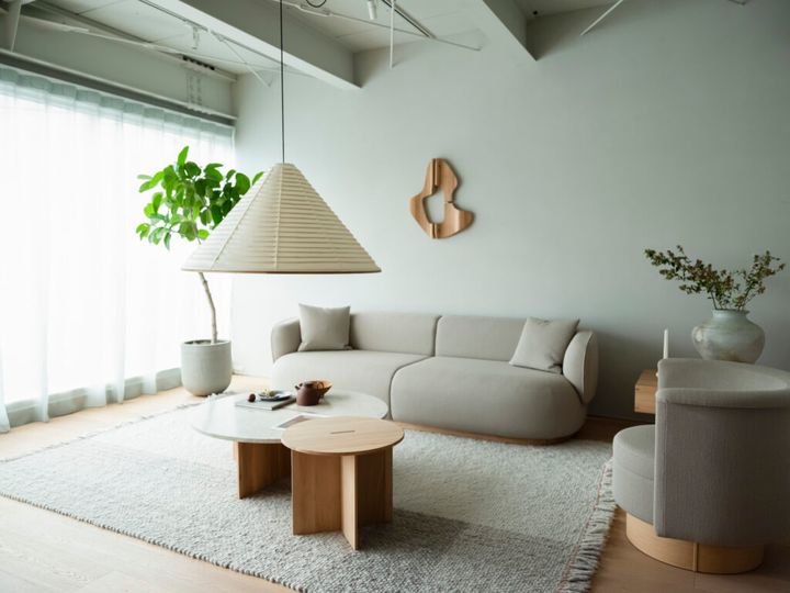 空間にコンテンポラリーな魅力をもたらす〈Karimoku Case〉でスタイリングされた2階のショールーム。