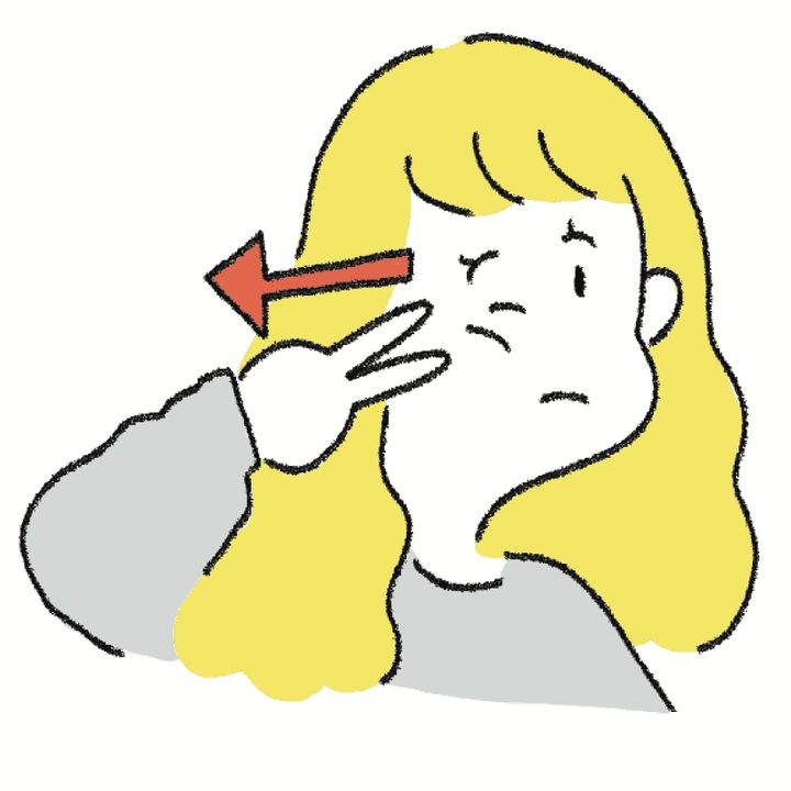 チョキで目をはさんだら、そのままこめかみに向かってチョキの手を滑らせます。こめかみ付近にはリンパのゴミ箱があるため、そこへ目の周りの老廃物を送り込むわけです。これを何度か繰り返していけば、自然と目がぱっちり。気分もスッキリしてきます。ただし効果が感じられるのは数時間のみです。