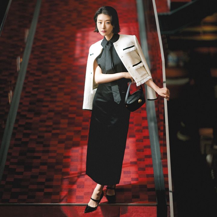 ツイードジャケット¥99,000(ボーダーズ アット バルコニー)タイ付きブラウス¥29,700(デ・プレ)ペンシルスカート¥25,960(ネイヴ/ネイヴ〈オンワード樫山〉)バッグ¥51,700(ニューイ/ショールーム ロイト) パンプス¥145,200(マノロ ブラニク/ブルーベル・ジャパン)ピアス¥10,450(ソワリー)