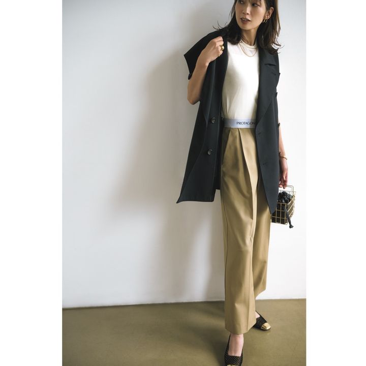 パンツ¥39,600(プロタゴニスタ/アマン)ジレ¥72,600(アドーア)Tシャツ¥13,200(プロタゴニスタ/ジュンカスタマーセンター)バッグ¥69,300(ザンケッティ/八木通商)パンプス¥59,400(ネブローニ)チョーカー¥44,000バングル¥88,000(ともにブランイリス/ブランイリス トーキョー)ピアス¥3,960〈ヘンカ〉リング[右手]¥3,900〈soie〉(ともにロードス)