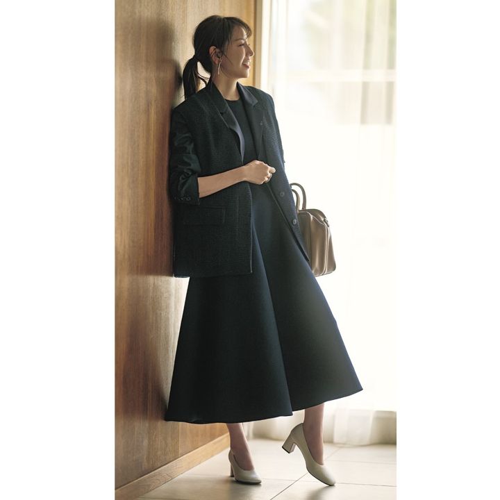 ジャケット¥35,200(Dunst/ジャーナル スタンダード 自由が丘店)衿付きジレ¥88,000(デパリエ/デパリエ 伊勢丹新宿店)ワンピース¥101, 200(マディソンブルー/マルティニーク ルミネ横浜)バッグ¥12,100(アダム エ ロぺ)パンプス¥64,900(ペリーコ/アマン)ピアス¥22,000ダブルリング¥38,500(ともにブランイリス/ブランイリス トーキョー)