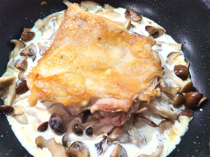 5. 白ワインを加え、フライパンやきのこに付いている旨味をこそぎ落とし、生クリームを入れます。そこに鶏肉を皮目を上にして戻し、トロッとするまで5分ほど煮込みます。