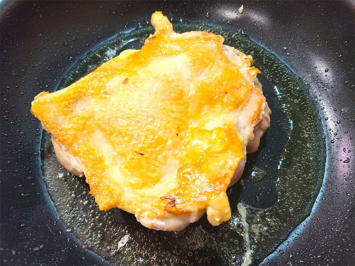 3. 鶏の皮目を下にして、弱火でじっくりと皮がパリパリになるまで15分ほど焼きます。その後、鶏肉を裏返しにして、軽く焼いたら一度取り出します。このとき完全に火が通っていなくも大丈夫です。