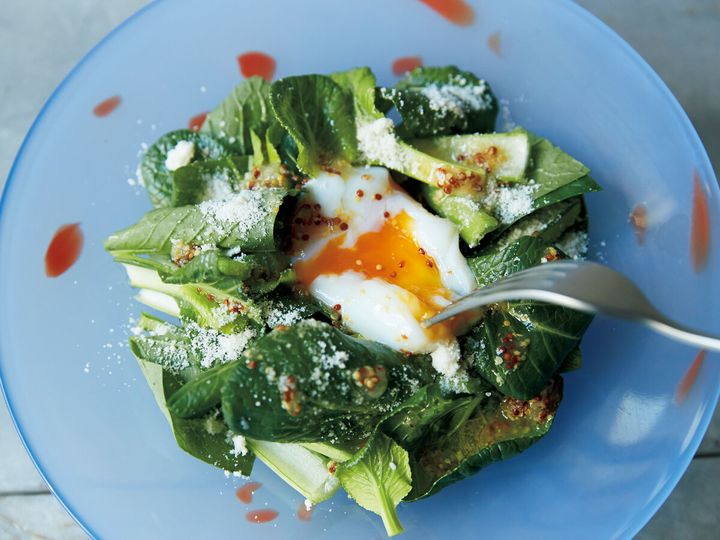 小松菜は根元を切り、長さ3cmに切って器に盛る。〈マスタードドレッシング〉の材料を混ぜる。小松菜に温たまをのせて粉チーズをふり、ドレッシングをかける。