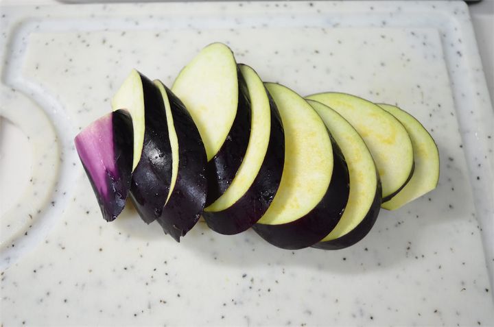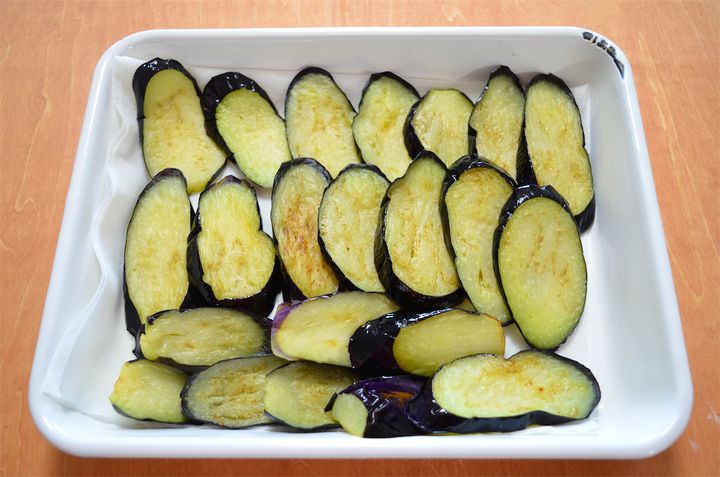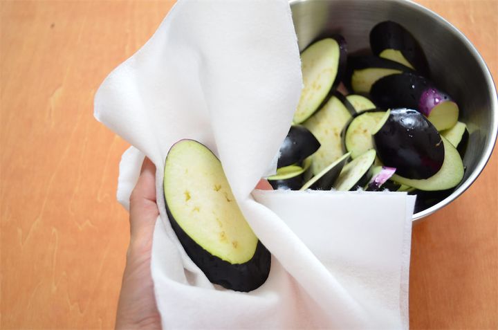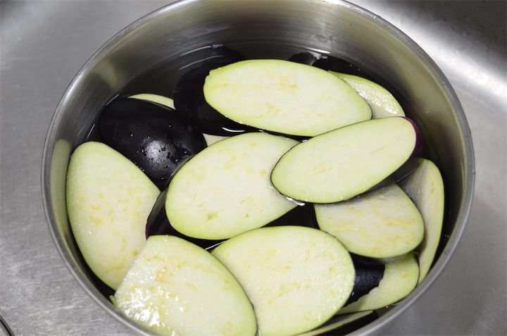 1.なすのヘタを切り、5mm幅の斜め切りにする。水にさらしてアクを抜き、キッチンペーパーで水気を取る。