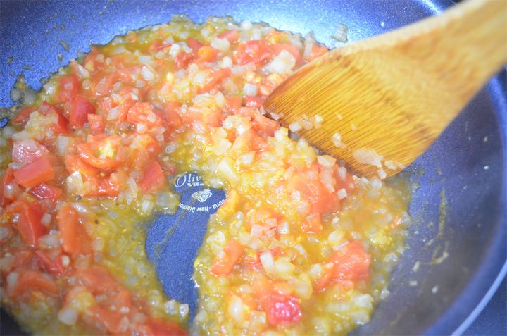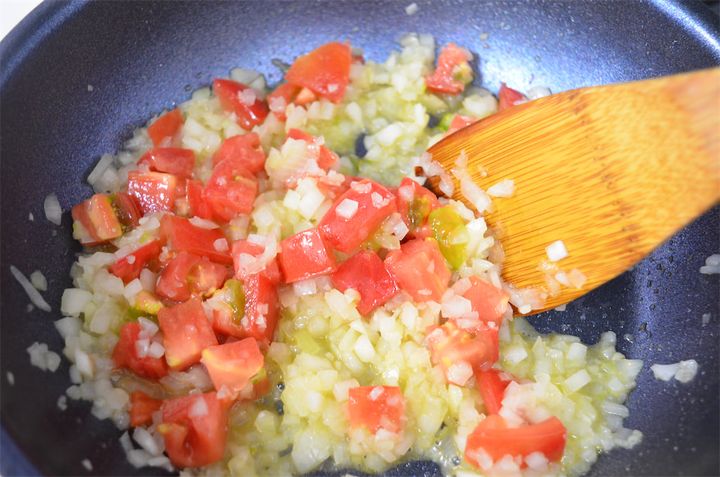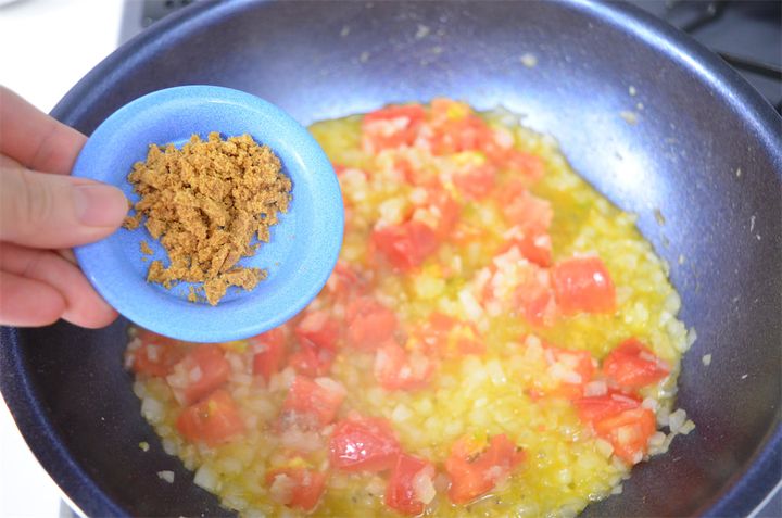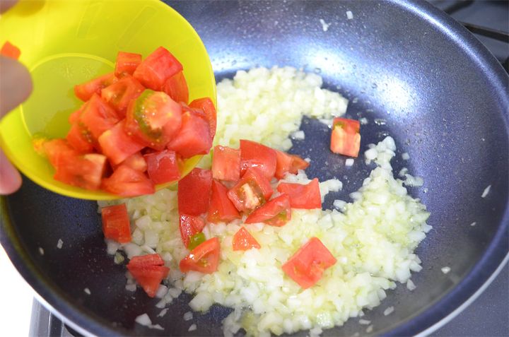 5.玉ねぎに火が通ったら、トマトを入れてさらに炒める。