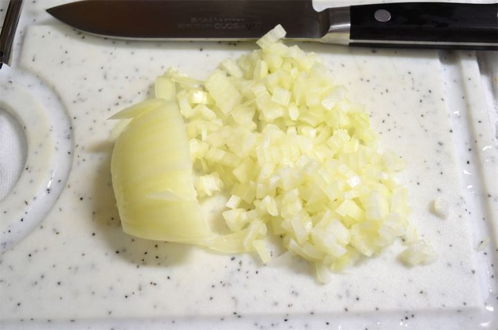 2玉ねぎとにんにくをみじん切り、トマトは粗みじん切りにする。