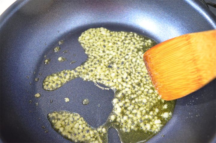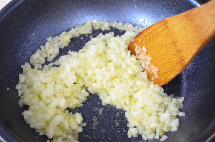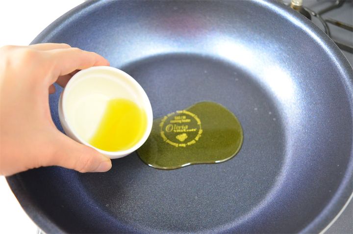 4.熱したフライパンにオリーブオイルを入れ、にんにく、玉ねぎの順で炒める。