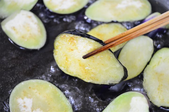 3.フライパンに油を熱し、1のなすを素揚げにしたら、油を切っておく。