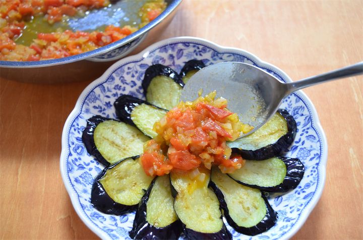 のなすをお皿に並べて、6のソースをかける。仕上げにパセリをのせて完成。