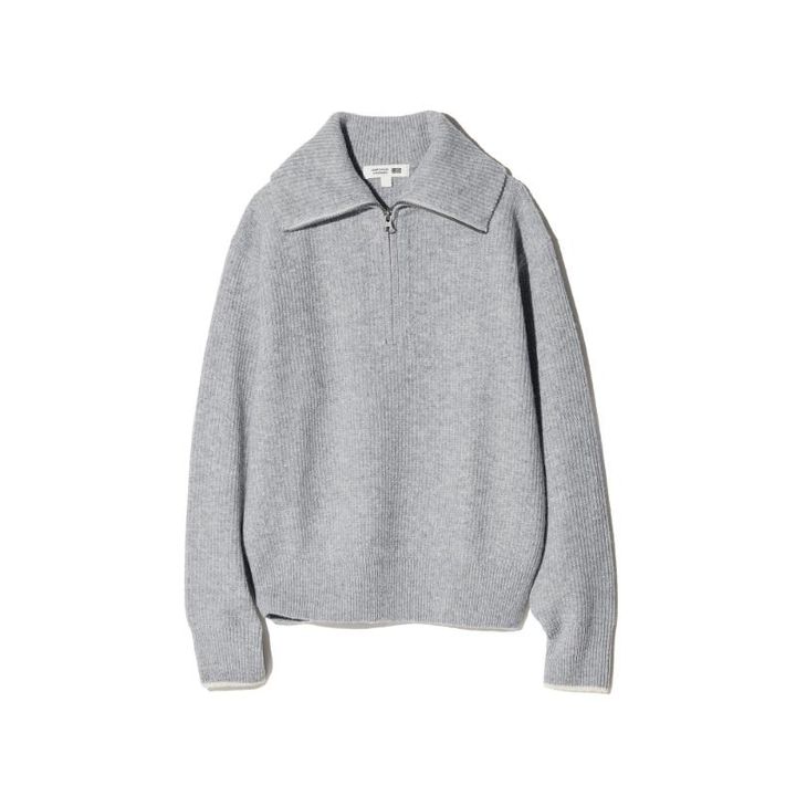 トレンド続行のハーフジップ、カジュアルすぎに見せたくないならこのコレクションがおすすめ。プレミアムラムウールの優しい風合いと、袖口に細く入った白のティッピングが可愛げをプラスしてくれます。