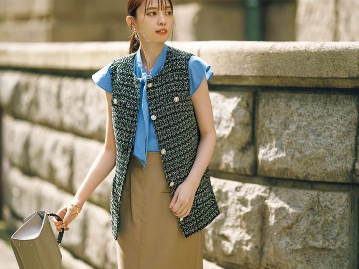 暑くてもきちんと感が必要なオフィス服には、端正なジレが最適! 洒落感高まるボウタイブラウスで上級見えを狙って。