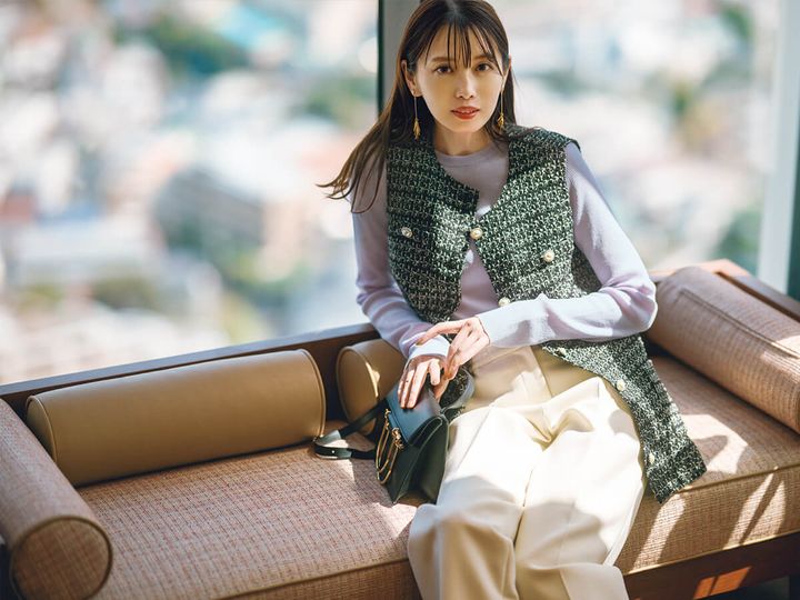 ジレ/着回し ニット¥8,470/Mila Owen パンツ¥26,400/セテンス バッグ¥59,400/メアリ オル ターナ(AL Design In c.) イヤリング¥6,820/イットアトリエ(14 SHOWROOM)