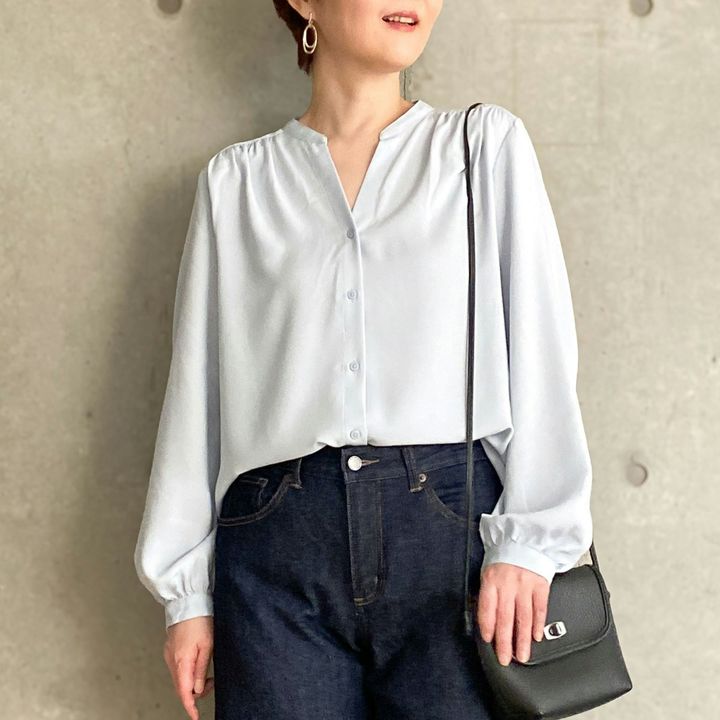 上品なドレープがきれいに見せるレーヨンギャザーブラウス。華やか&フェミニンな雰囲気で、秋に1枚で着たいブラウスです。襟がないスキッパーデザインで首まわりもスッキリ見えて、顔も明るく映りますよ。