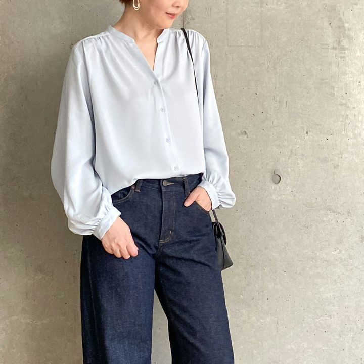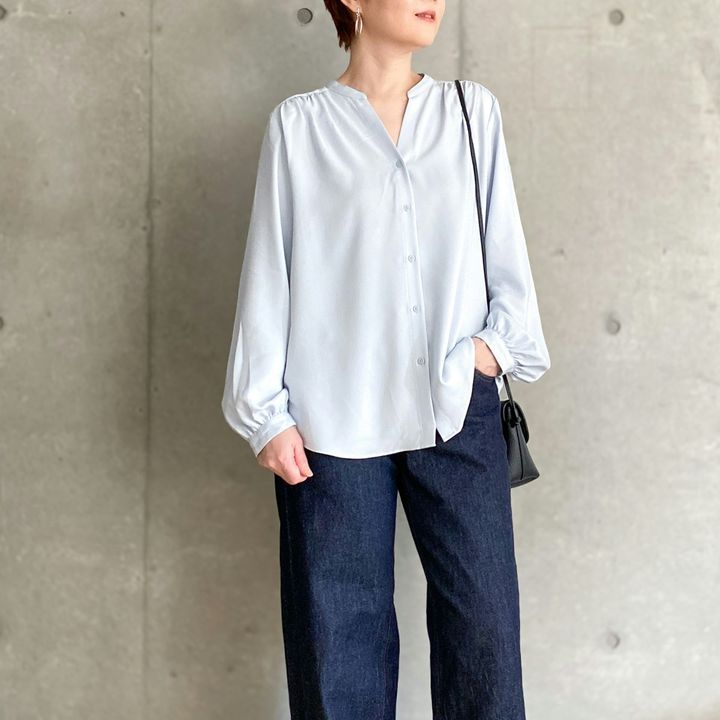 ユニクロのサテンブラウスは、シンプルなデザインのシャツなので派手過ぎず普段着にとっても使いやすいです。やわらかい素材なので体のラインが出るため華奢見えしますし、インナーとして重ね着にも使えて一枚持っておくと便利です。一見難しそうなサテン素材ですが、カジュアルなボトムスにも合うのでこの秋冬ぜひ挑戦してみてください。