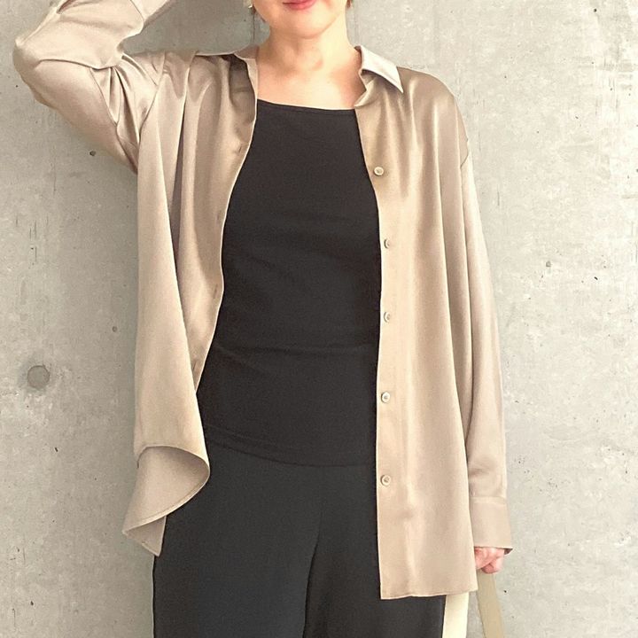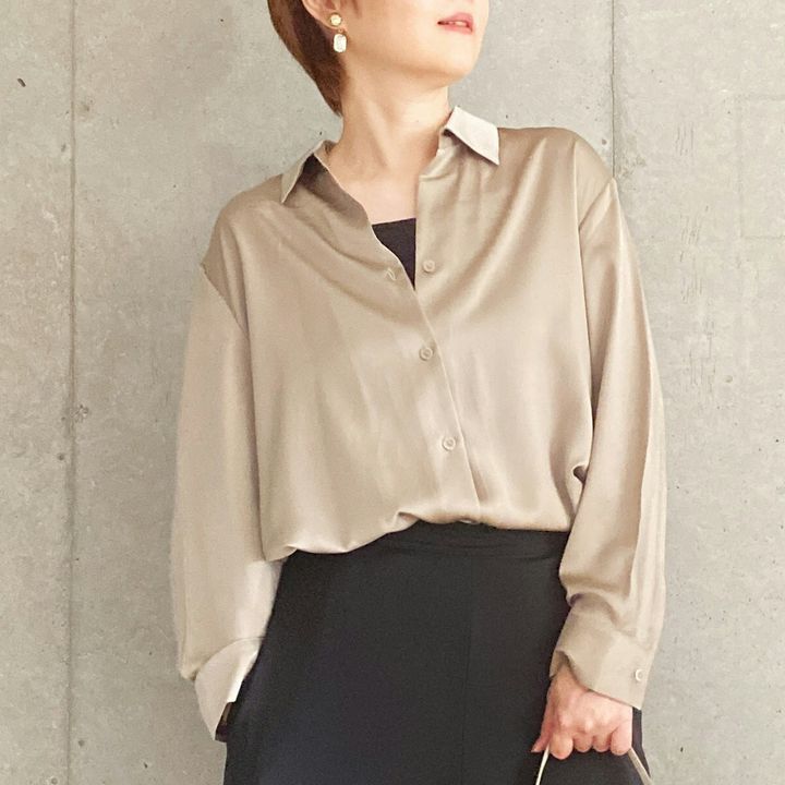 ハリのある上質なサテン素材で光沢感がラグジュアリーな雰囲気です。光沢が顔に映え、顔まわりが華やかに明るく見えます。コーデにも高級感が出て夜の食事会やお出かけなどにおすすめ。お肌の色を美しく見せてくれるでしょう。インナーやボトムスはブラックでシックすると落ち着いた感じになりますよ。