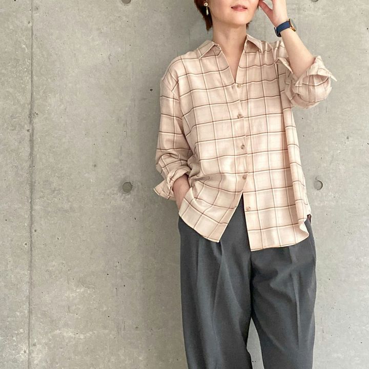 こちらもスキッパーデザインで首もとがスッキリ。首が見えるデザインは顔まわりを明るくするポイントですね。正統派のウインドウペン柄が大人女性にもぴったりです。チェックシャツはカジュアルになりがちですので、時計やアクセサリーにゴールドを使うとよいです。