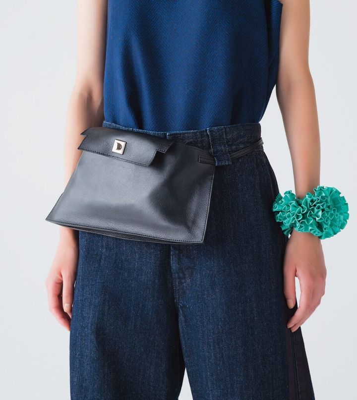 ベルトループに通して使うほか、ショルダーバッグとして肩に掛けても。ベルトバッグ¥30,800(イッチ/イチギャラリー TEL:03・5454・5111) シュシュ¥10,450(グッド スクイッシュ/フィルグ ショールーム TEL:03・5357・8771)