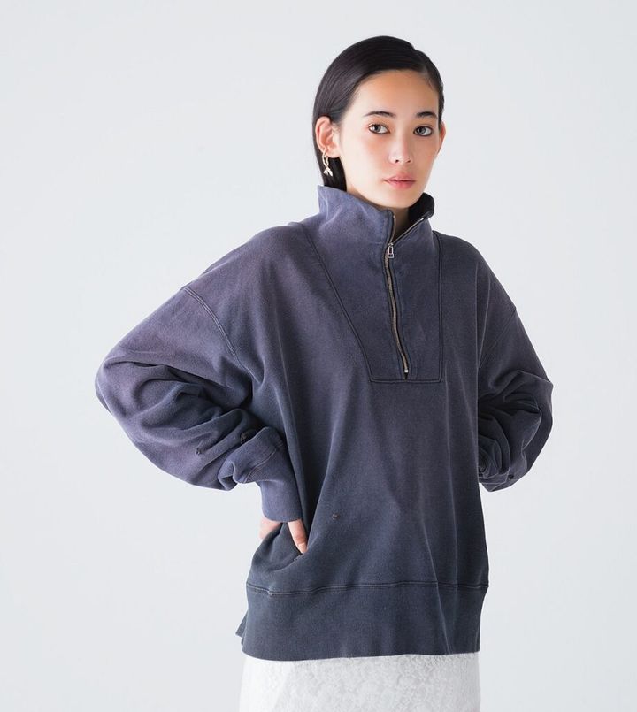 絶妙なくすみカラーがこなれ感を演出。袖や裾の長めのリブもアクセントに。ハーフジップスウェット¥41,800(コンコース/スタンド ) レーススカート¥46,700(アイレネ/リステア TEL:03・3404・5370)