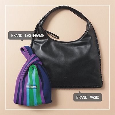 「基本的には小さめ、かつファスナーがないものが好き。ふだんは、リップとお財布、カードくらいしか持ち歩かないのでLASTFRAMEのようなものにポイポイ詰めて持ち歩いています。毎年、配色が変わるマルチカラーなのが集めたくなる理由。伸縮性があるので、エコバッグとしても使っています。